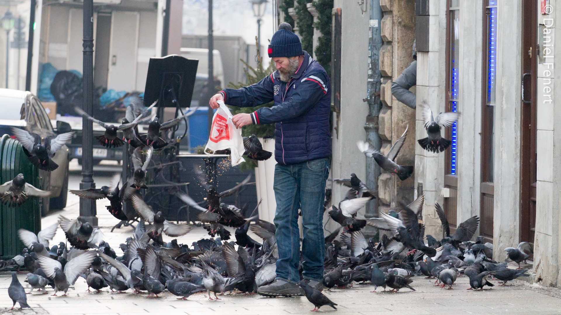 Friday morning On Grodzka Street (Kraków, Poland), the only sound is birds flapping, waiting for their breakfast.